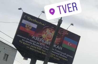На баннере, установленном на одной из центральных улиц Твери, написано поздравление в адрес Азербайджана.