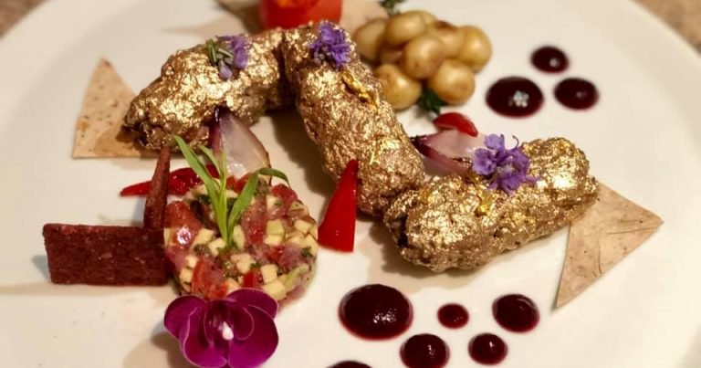 Особо популярный у азербайджанцев люля-кебаб представляет собой мясной фарш из рубленной баранины, нанизанный на шампур и зажаренный на мангале, с добавлением лука. Покрыв его золотом, Акперзаде придал ему особую "элитарность".